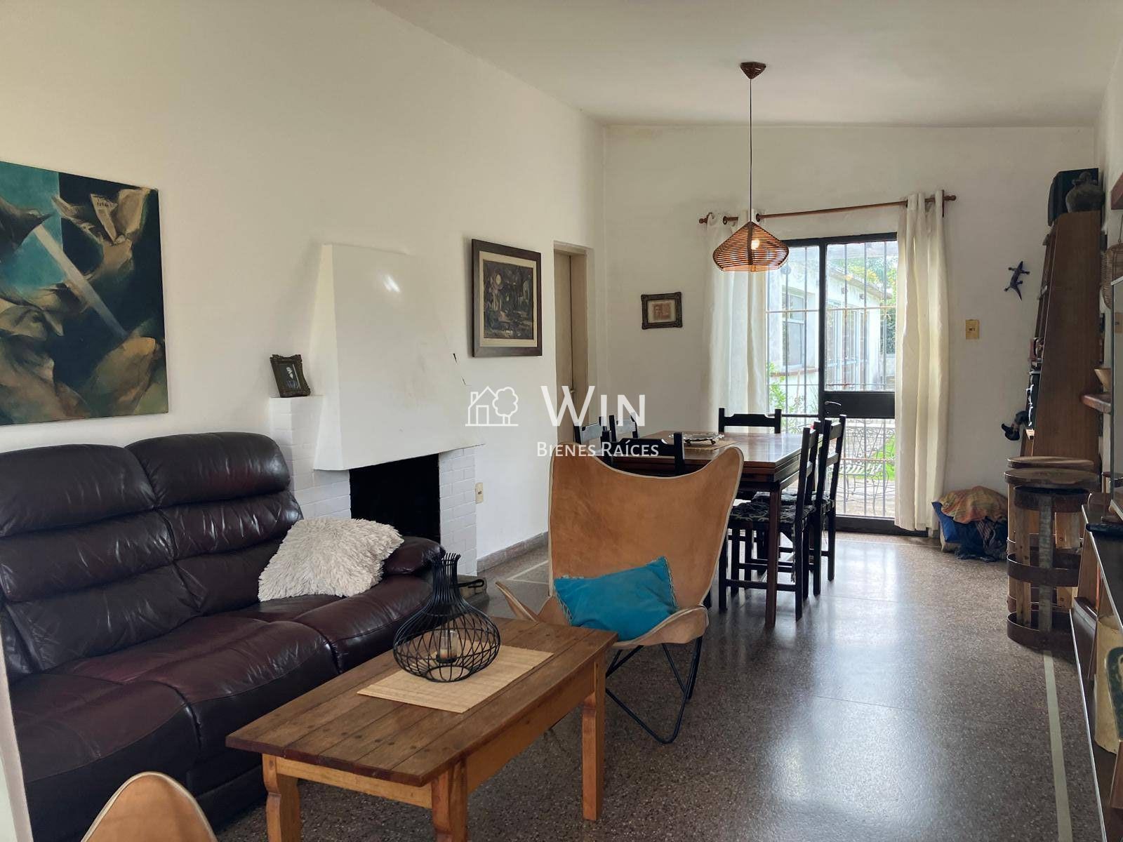 Living comedor con estufa a leña y salida al fondo
